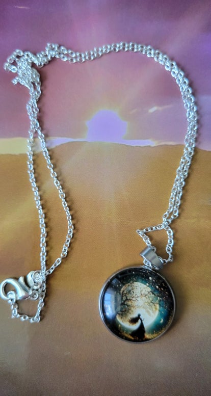 Stunning moon charm with a elegant lady dressed in black with long flowing hair, made of glass on a 45 cm sterling silver chain .Comes in a gift box with tag .
