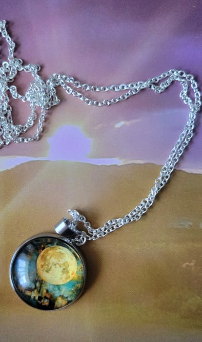 Celestial moon shining through a window and flowers below charm on a 45 cm sterling silver chain.Comes in a gift box with tag ..The effect is a blend of nature's soft glow and the symbolic beauty of moon-themed jewelry, creating a romantic and dreamy atmosphere.