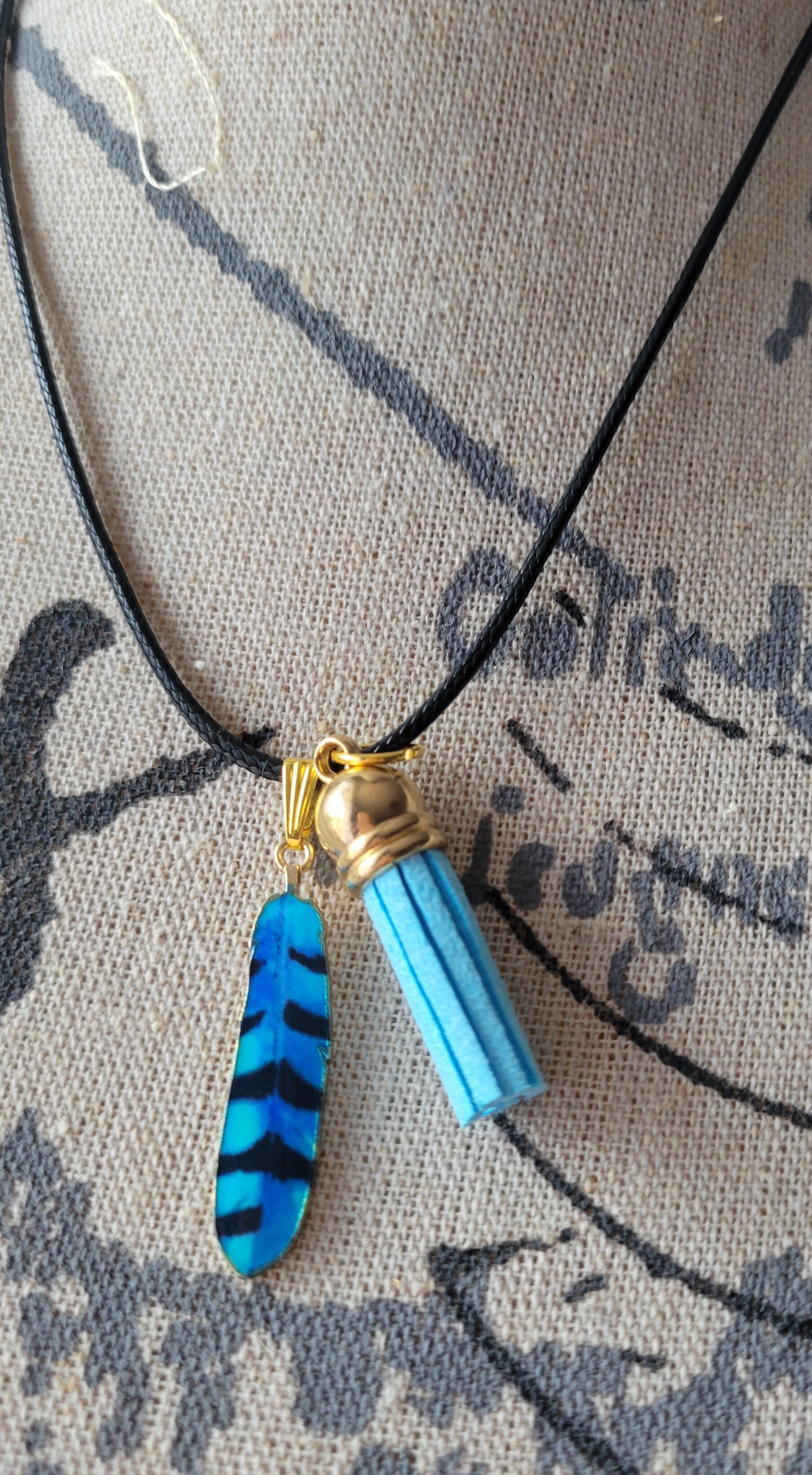 Emamel feather in blue and black with a blue faux leather tassle on a faux leather cord ,the feather symbol means .Protection,Spritual connection ,freedom hope and more .