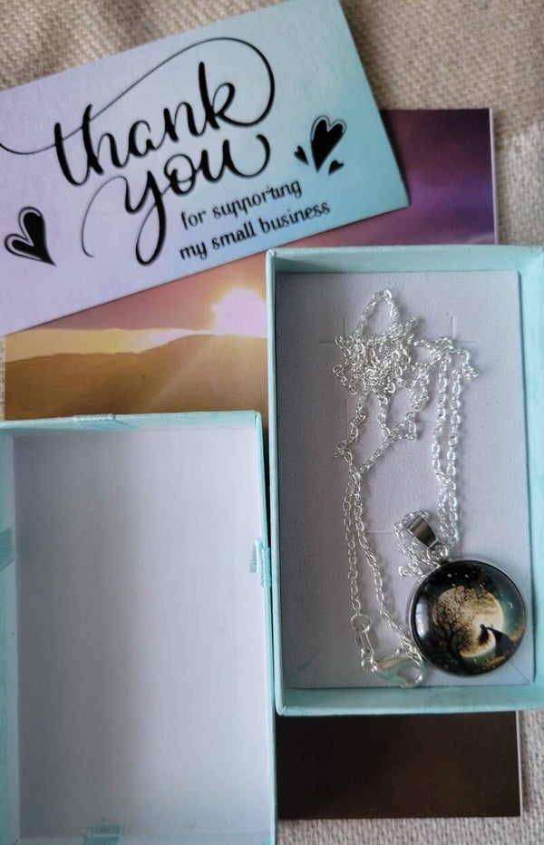 Stunning moon charm with a elegant lady dressed in black with long flowing hair, made of glass on a 45 cm sterling silver chain .Comes in a gift box with tag .