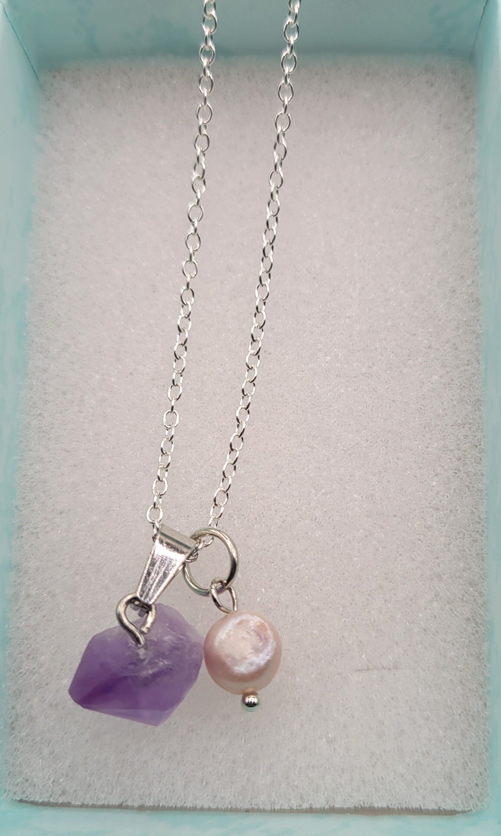 Amethyst Crystal and fresh water pearl ,on a 20 inch 925 Sterling silver chain .perfect gift for someone ,will come in a blue gift box