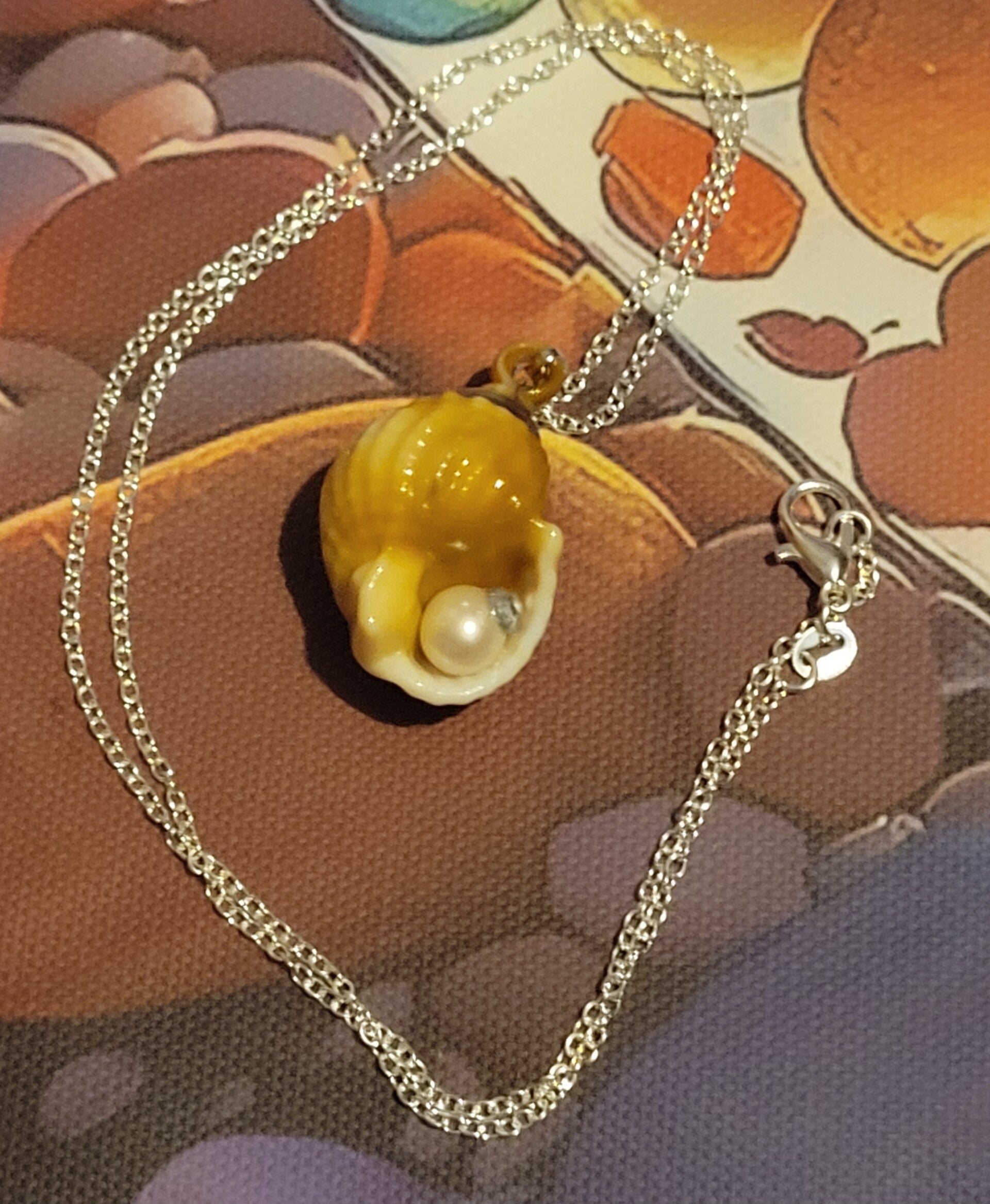 One of Acrylic Conch shell with a fresh water Pearl anfy a tiny Crstyal on a 45 cm 925 Sterling silver chain