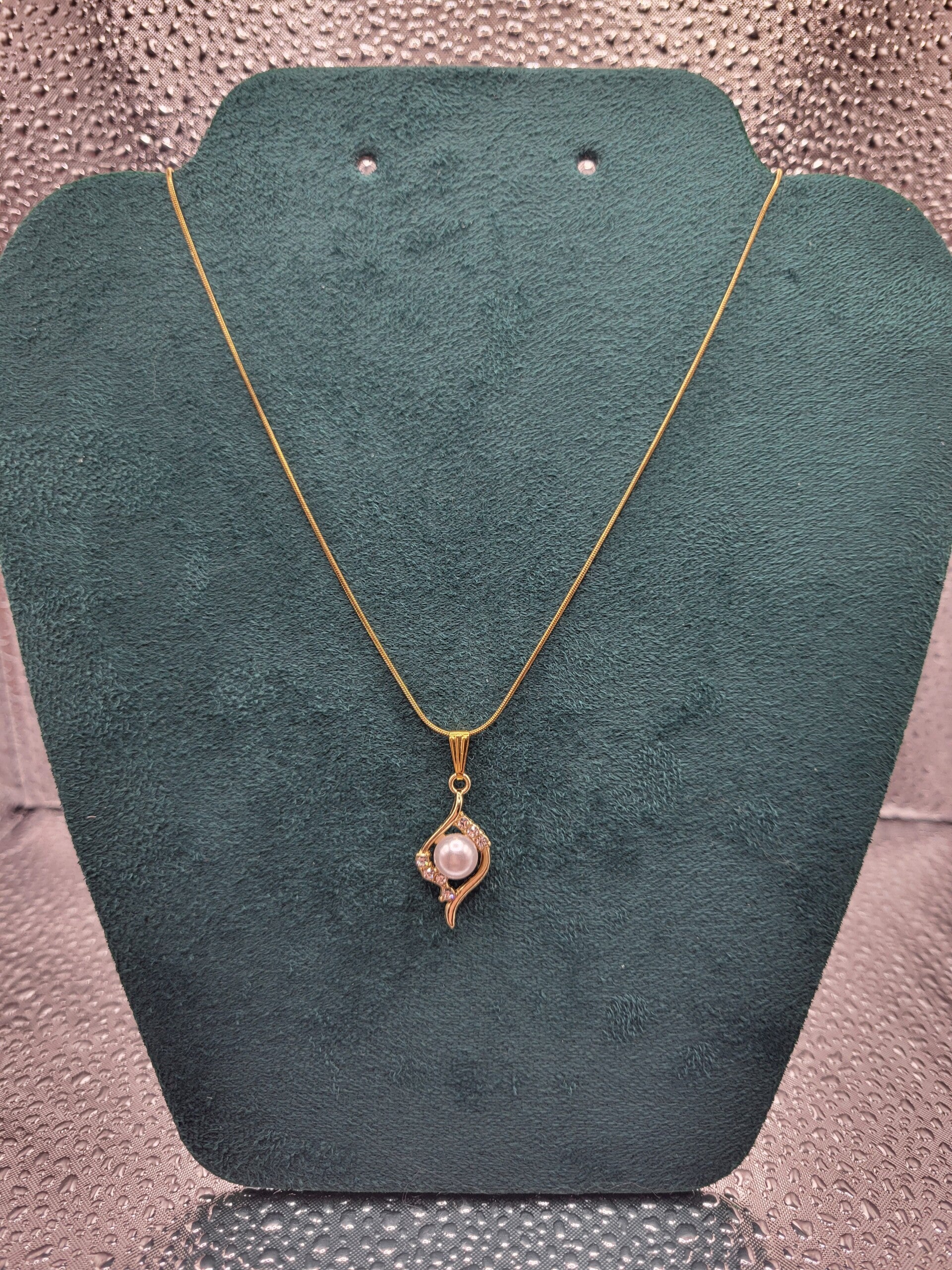 Simple Elegant Inlaid Rhinestone Gold colour Geometric Pendant with a faux pearl on a 18kg plated 316L Stainless steel 50 cm snake chain .Adding