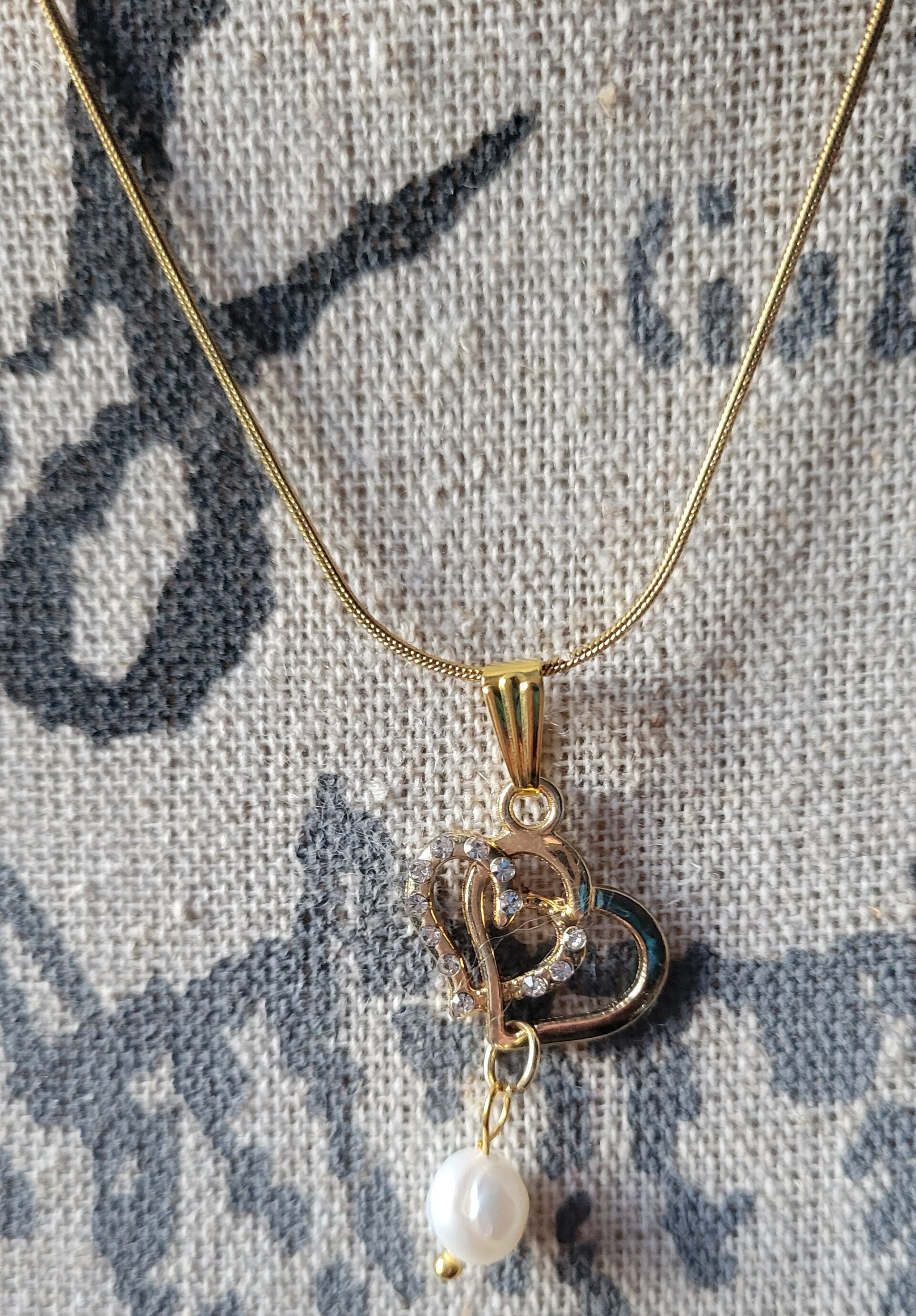 Lovely double heart with Rhinestones Gold colour with a fresh water pearl on a 18ktg plated 316L stainless steel hypoallergenic 50cm snake chain,